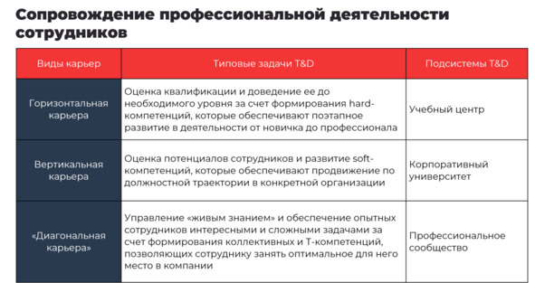 • Сопровождение деятельности на разных этапах профессиональной карьеры позволяет функции T&D целостно и системно объединить все свои задачи и активности. Без нее работа с кадровым резервом будет ритуальной, то есть имитационной.