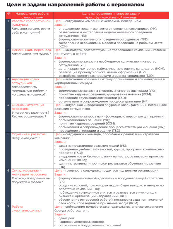 Вход: сочетающиеся со стратегическими целями компании и согласованные с управленческой командой и командой среднего менеджмента направления работы с персоналом. К слову, направления работы с персоналом являются «входом» еще и для функции HR.