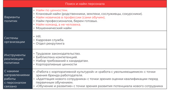 В данном направлении возможно большое количество разнообразных политик, которые очень отличаются по своей стратегичности. Например, мошеннический найм (сотрудник бесплатно работает в течение испытательного срока, после чего его увольняют под различным предлогом) оставляет руины от бренда работодателя. Клановый найм практически ставит крест на управлении по ценностям и управлении карьерой. Может ли сын полковника стать маршалом? Нет, потому что у маршала есть свой сын. Найм только по профессиональным критериям, игнорируя личностные качества, приводит к большому количеству конфликтов.