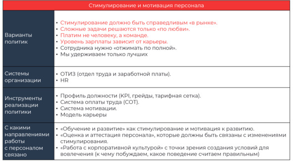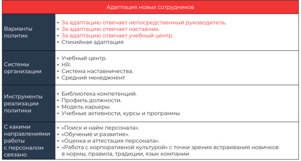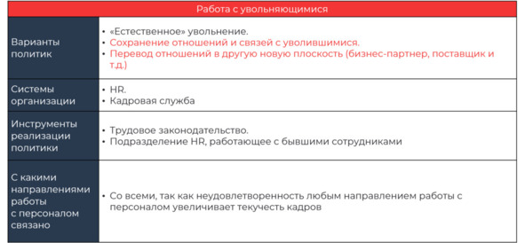 Синим шрифтом выделены те варианты политик, которые работают на развитие и стабилизацию персонала.