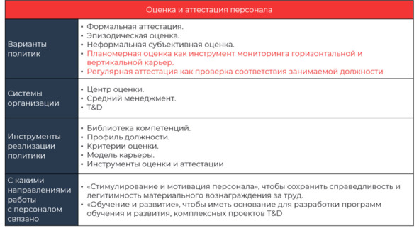 • На практике HR сейчас чаще проводит аттестацию, а T&D – оценку. Перспективным представляется, чтобы собственно процедурами оценки и аттестации занималась функция T&D, а HR взяла на себя «административную прописку» результатов аттестации и оценки (закрепление новых должностей в распоряжениях и приказах, направление на обучение и т.п.).