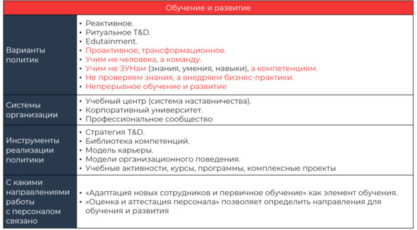 • Обучение и развитие базируются либо на проактивном, либо на реактивном подходе. В первом случае обучение и развитие – это производные от стратегии компании, то есть являются заказом управленческой команды (работа функции T&D – декомпозиция стратегии организации «на язык» T&D). Во втором случае заказчиками обучения и развития являются топ-менеджеры и руководители среднего звена, которые «затыкают дыры», возникшие из-за изменения среды (как посредник выступают HRBP, без которых реактивный сервисный подход не работает). Например, обучение саморегуляции из-за возросшей неопределенности внешней среды.
