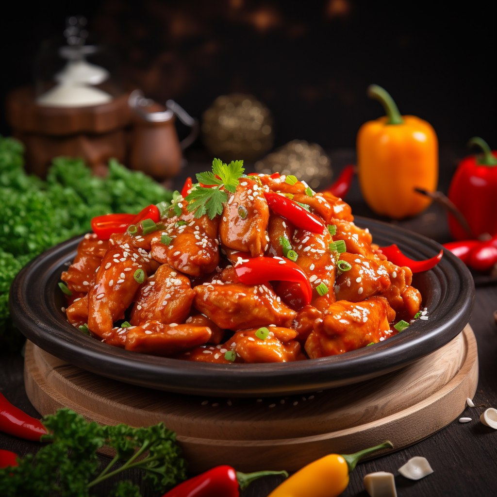 Ли Минь, улыбнувшись, сказала: "Это мое собственное творение – курица, тушенная в сладко-кислом соусе с болгарским перцем и морковью." Гости были в восторге и попросили рецепт.