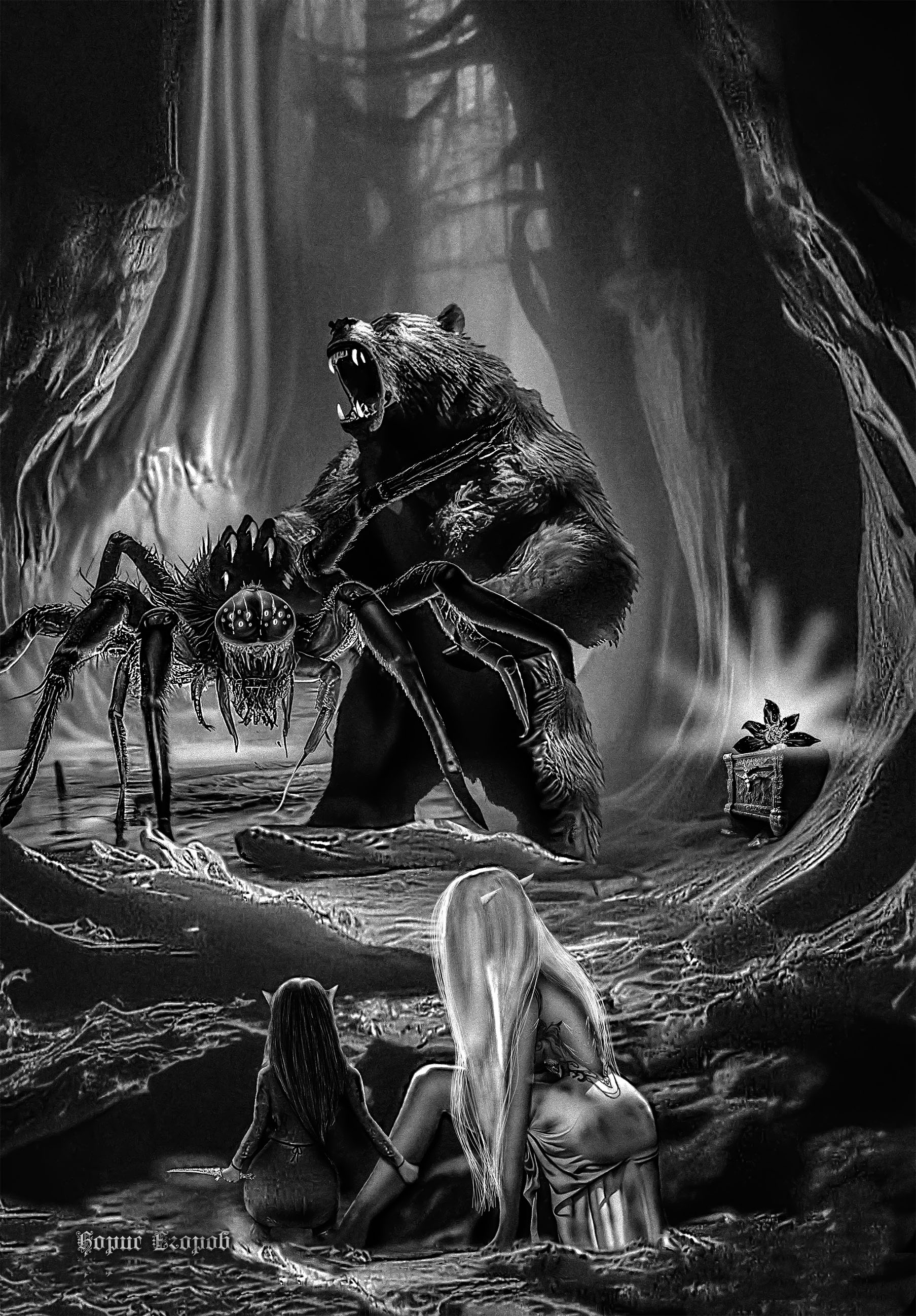 Медведь всё кусал и рвал паучиху на части. Огромными, острыми, как бритва, когтями он полоснул её по голове, и половина глаз вытекла из глазниц на пол. Затем он прошёлся по её животу, и из него полилась едкая зеленовато-белая слизь. Паучиха завизжала от боли и попятилась назад, оставляя след из липкой жидкости. Лапы медведя стали прилипать к ней, и ненадолго он был обездвижен. Паучиха воспользовалась моментом и резким движением вспорола живот огромному зверю своей острой лапой.
