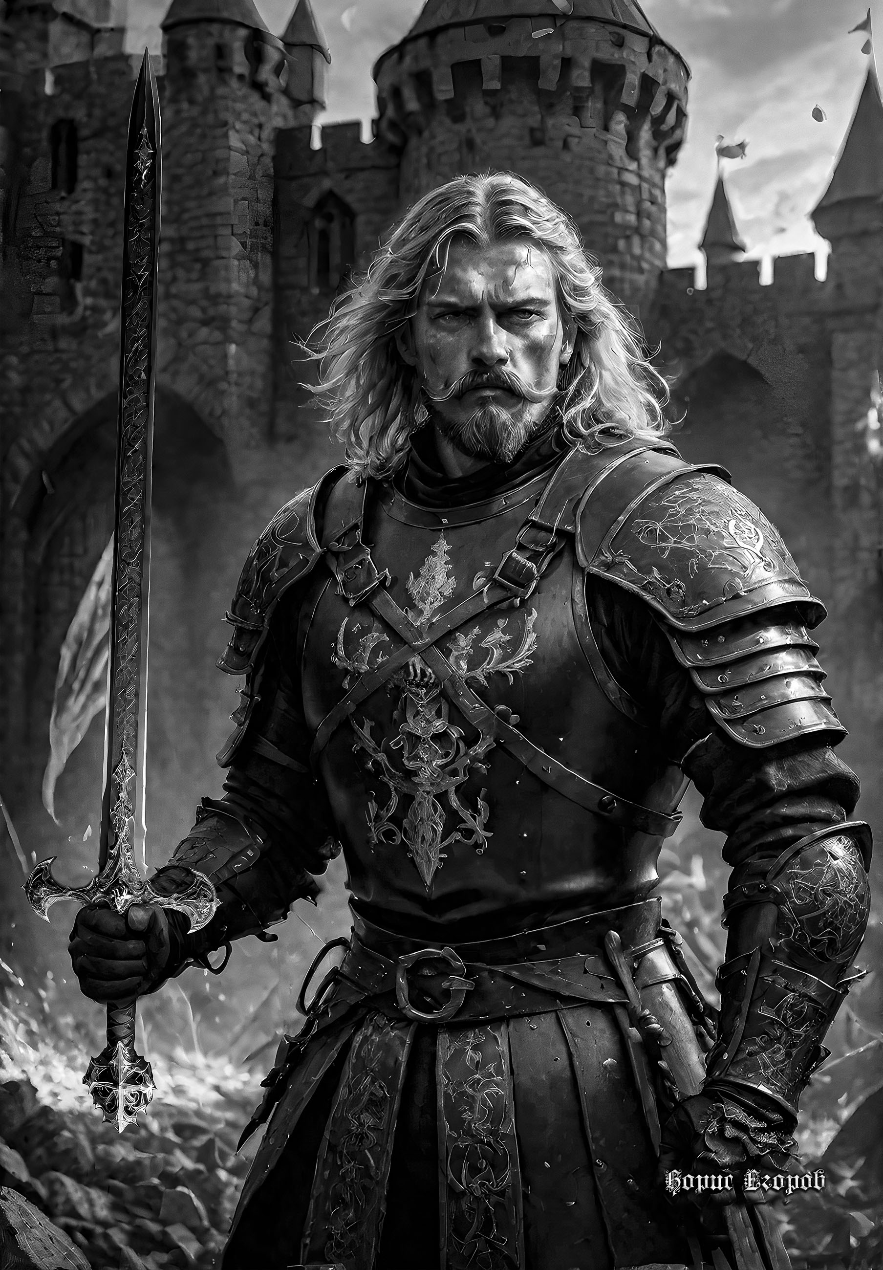 Он поднялся, взял в руки своё оружие и понемногу стал приходить в себя, как вдруг внизу послышались громкие звуки и треск разлетающихся камней. Стена с грохотом провалилась, и капитан вместе с другими солдатами упал вниз. Пролежав какое-то время, он нашёл в себе силы подняться и подобрал своё оружие – двуручный меч из чёрной драконьей стали, богато украшенный золотом и серебром. Драконью сталь умели изготавливать только истинные мастера кузнечного дела. Для её закалки применяли огромную печь, и сам процесс занимал чуть ли не сутки. Но результат оправдывал средства, и в итоге сталь получалась более прочной, стойкой к коррозии и имела чуть ли не вдвое лучшие качества обработки, а также приобретала чёрный оттенок и характерные только для неё разводы по всей поверхности. Если правильно заточить такую сталь и иногда обрабатывать и ухаживать, то лезвие останется острым надолго. Около рукояти имелся герб, такой же, как на доспехах, – воющий на луну белый волк. Это был наградной меч для торжеств и других мероприятий, и по-хорошему его не полагалось использовать в битве, но выбора не было.