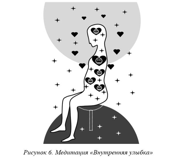 Для выполнения медитации «Внутренняя улыбка» сядьте удобно. Спина должна быть ровной и плотно прижатой к спинке стула. Расслабьтесь. Подышите свободно 2-3 минуты. Представьте, что вы находитесь в приятном месте (рисунок 6).