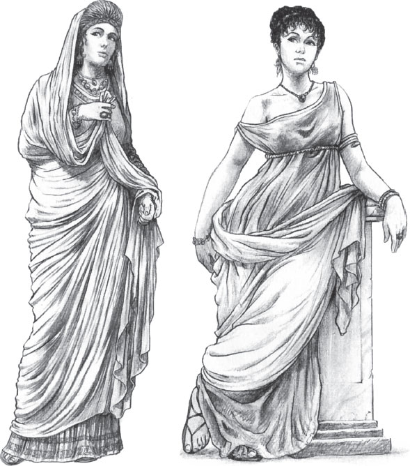 В отличие от современной эпохи мужская и женская одежда различается не так уж сильно. Женщины тоже носят одеяния, похожие на туники, – сто́лы (stolae), однако более длинные, доходящие до ступней. Но выглядят эти струящиеся одежды, похожие на греческие хитоны, несомненно, гораздо элегантнее. Особенность в том, что они схвачены не одним, а двумя поясками: помимо того, который на талии, есть еще один, под грудью, чтобы подчеркнуть ее форму и пышность.