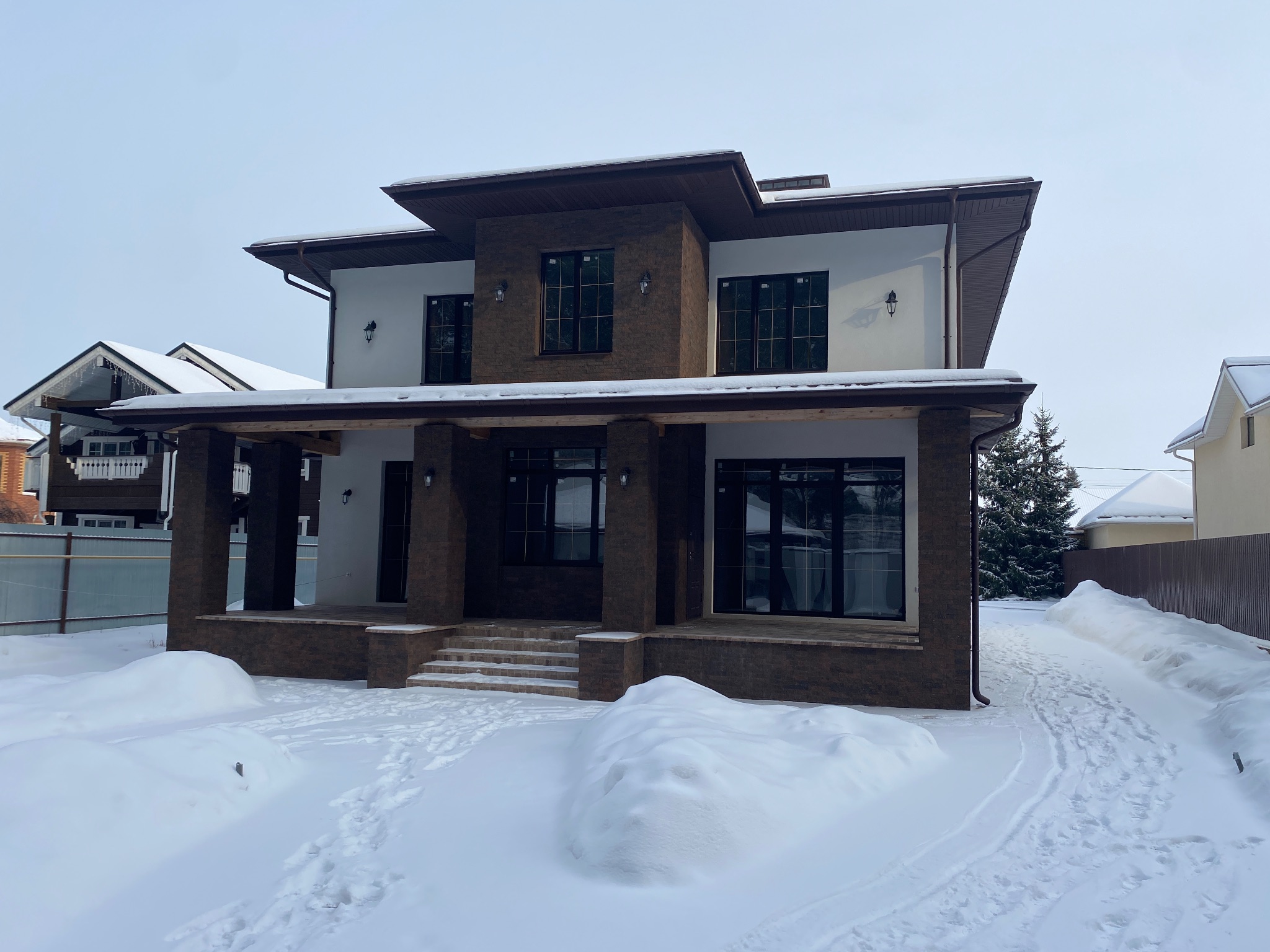 2. Предчистовая отделка: установка окон и дверей, отделка фасада, коммуникации (электрика, сантехника, канализация).