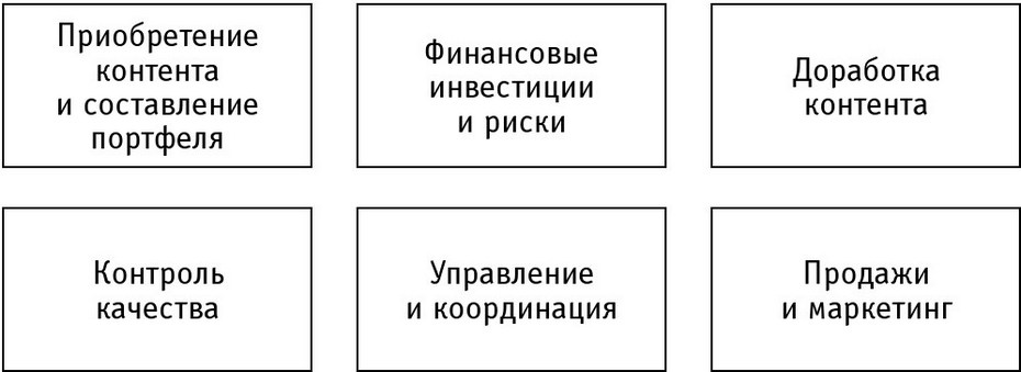 Поскольку издательская цепочка не является жесткой и конкретные задачи или функции могут исчезать в результате экономических и технологических преобразований, не делает ли это роль непосредственно издательства излишней? Каковы основные виды деятельности или функции издательства? Могут ли новые технологии сделать его деятельность ненужной и может ли кто-то другой заменить его? Можно ли устранить издательства из издательской цепочки? В последние годы эти вопросы поднимались довольно часто. В эпоху, когда любой может публиковать текст в интернете, кому еще нужны издательства? Но эти вопросы сложнее, чем может показаться на первый взгляд, и для правильного ответа на них необходимо более тщательно проанализировать ключевые функции, традиционно выполняемые издательствами, и отделить их от других видов деятельности, которые могут быть переданы сторонним организациям или специализированным фирмам. На рисунке 4 показаны шесть ключевых функций издательства – выполняя именно эти задачи или функции, издательство традиционно вносит свой особый вклад в процесс создания ценности.