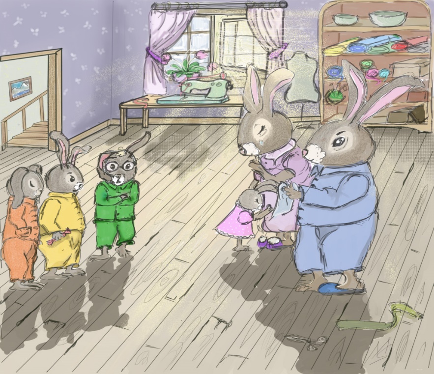 Случилось это пренеприятное происшествие ранним утром в доме у зайцев. Ну, и переполох поднялся! Зайчат и папу Кап-Тяпа разбудил пронзительный крик. Сонные зайчата мигом повскакивали со своих уютных кроваток и бегом бросились в низ. Шум и рыдания доносились из маминой швейной мастерской. Папа заяц был уже там, стоя в пижаме и одном тапке он успокаивал маму зайчиху, которая сильно плакала.
