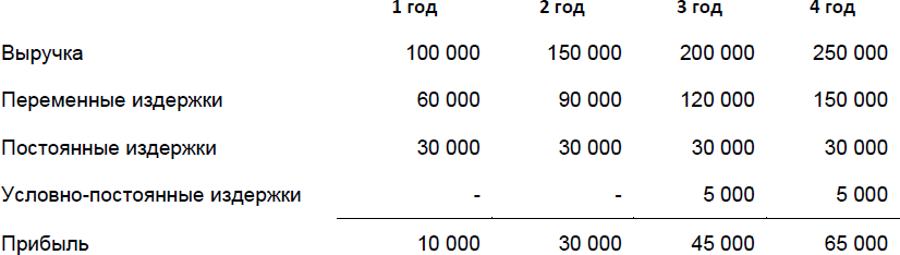 Двукратный рост объема производства на третий год деятельности компании потребовал дополнительных постоянных издержек, например, аренды еще одного склада или принятие на работу новых административных сотрудников, что и нашло свое выражение в появлении суммы 5 000 условных денежных единиц в месяц в строке «Условно-постоянные издержки». В течение четвертого года этих ресурсов хватило, чтобы обеспечить дальнейший рост объемов производства, а, значит, и выручки.