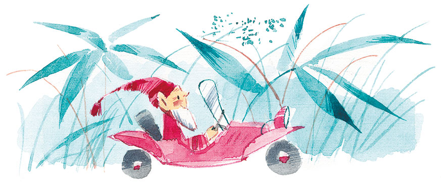 Так вот, однажды в июне, в сумерках, после дождя, когда всюду тепло, и туман, и немножко грустно, в лесу, под маленькими ёлочками, где мох, завёлся гномик. «Подожду, вдруг ещё кто-нибудь заведётся», – решил гномик и сел на пенёк. Но никто не появлялся «Значит, я завёлся один, – сообразил он. – Вперёд! К делу!» Он выбрался на дорогу. Дорога была коричневая. На ней были лужи, и в них отражалось светлое вечернее небо. В лесу становилось всё тише. Птицы засыпали. От травы и дороги поднимался туман. «До чего же хорошо жить на свете!» – подумал гномик. На берегу большой лужи он увидел красный игрушечный автомобиль, вскочил в кабину и помчался, освещая дорогу маленьким фонарём, сделанным из старой лампочки от ёлочной гирлянды.