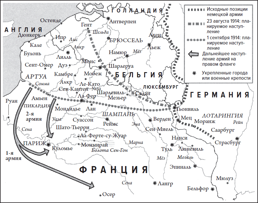 У французов тоже имелся план войны против Германии. Разрабатывать его начали в 80-х годах XIX столетия. В этот план неоднократно вносились изменения, и вариант XVII предполагал именно ту «любезность» немцам, возможность которой отвергал Шлифен, – наступление через франко-германскую границу в Лотарингию и в направлении Рейна. По мнению Шлифена, это в наименьшей степени соответствовало интересам самой Франции. Дело в том, что в 80-х годах XIX века не только Франция, но и Германия потратила очень много сил и средств, чтобы усовершенствовать фортификационные сооружения, защищавшие ее территорию. Провинции Эльзас и Лотарингия, вошедшие в состав новой германской империи в 1871 году, были хорошо укреплены Францией за два предшествующих столетия. Тем не менее по указанию имперского правительства Германии – теперь Эльзас и Лотарингия были территорией рейха и подчинялись Берлину – укрепления городов Мец и Тьонвиль на реке Мозель, а также Страсбурга на Рейне существенно обновили. Эти города служили воротами из Франции в Германию – французы недаром продолжали называть Страсбург Страсбуром. Шлифен не верил, что высшее военное командование Франции решится на такое безрассудство – атаковать их.