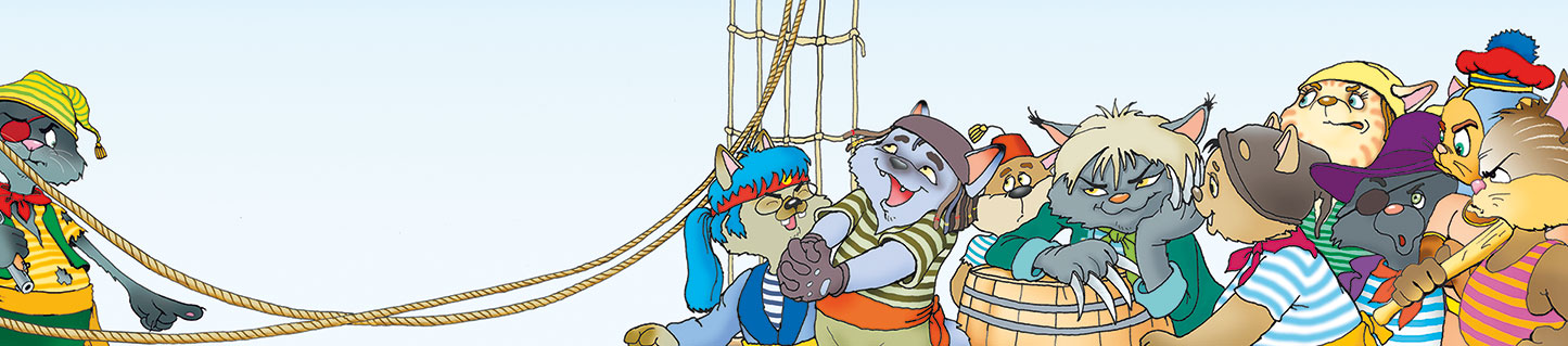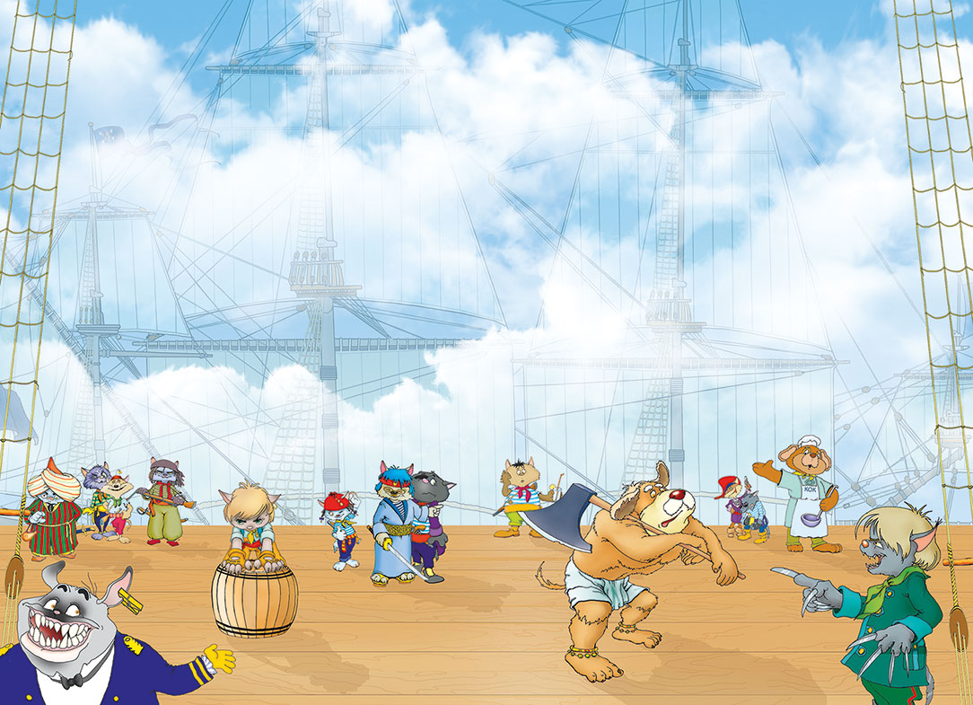 Через мгновение огромный волкодав в нелепой набедренной повязке уже стоял перед Железным Когтем, поигрывая топором. В нем чувствовались такая решимость, такая угрюмая преданность своему красавцу-капитану, что коты-пираты невольно вздрогнули.