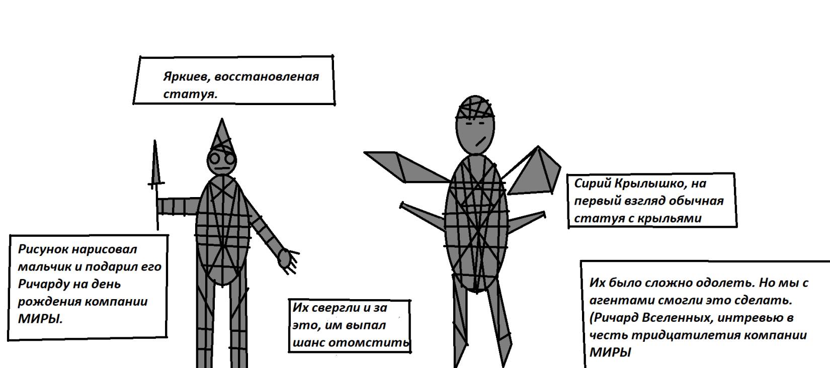 Агент дал Ричарду листок и пошёл по своим делам. Ричард внимательно осмотрел список и заметил там фамилию Яркиев. И это была не ошибка, так как у Яркиева не было имени. Там был Яркиев и Кен Яркиев. Ричард начал думать, что если Яркиевы встретятся, то тогда они объединяться против всех нас. А это будут очень плохо. Сбоку было написано что Яркиев и Сирий Крылышко вернуться, в своём втором образе. Ричард понял, что они вернуться в виде статуй. А человека в образе статуи невозможно победить, только сам человек может решить проиграет он или же нет. Он понимал что, скорее всего ответ у обеих статуй ответ будет отрицательным.