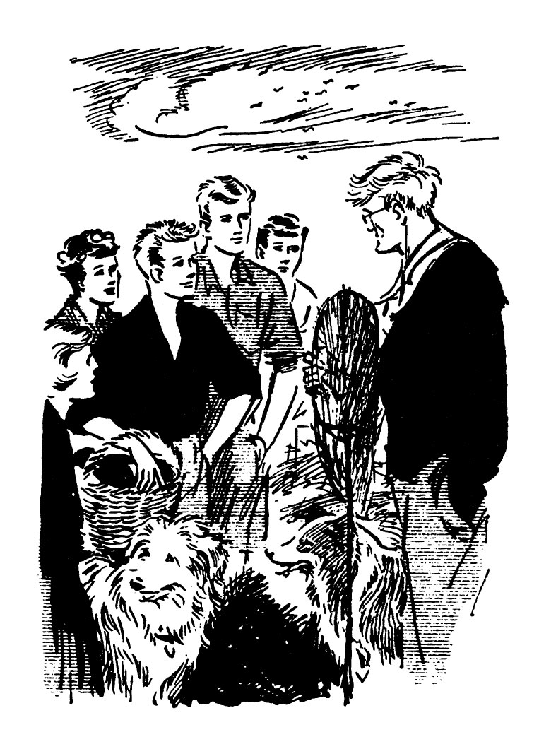 Из-за куста выступил мужчина несколько странного вида – растрёпанный, с сильно отросшими волосами и в очках, которые то и дело съезжали на кончик носа. В руках он держал огромный сачок. При виде пятерых ребят мужчина остановился.