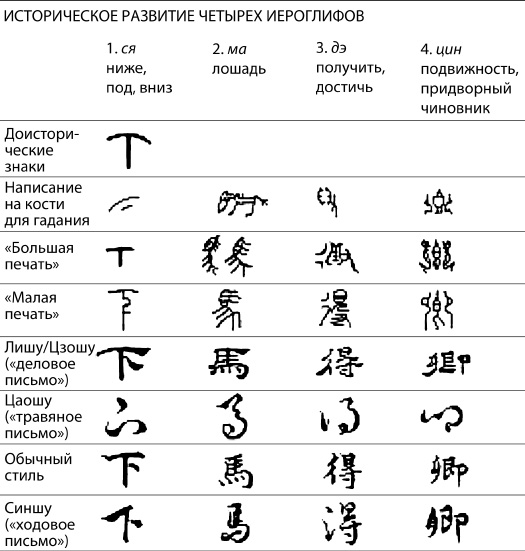 Иероглиф ма 馬, «лошадь», очень живописный: в нем можно увидеть ноги скачущей лошади и ее развевающуюся гриву. Его тоже можно использовать в качестве ключа, или фонетического элемента. Ключевой он в иероглифе юй 馭, который означает «ехать в запряженной колеснице», а фонетический – в иероглифе 媽, «мать», где ключом становится иероглиф 女, «женщина».