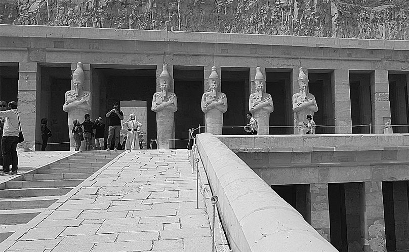 Адель объяснил туристам, что храм, к которому они подъедут через несколько минут, был одним из величайших достижений Нового царства. Архитекторы, работавшие здесь несколько тысяч лет назад, построили сооружение, состоящее из трех террас, гармонично переходящих одна в другую. Вероятно, Хатшепсут выбрала это место, потому что за несколько веков до этого здесь располагалось святилище Хатхор, богини плодородия, любви, радости и материнства.