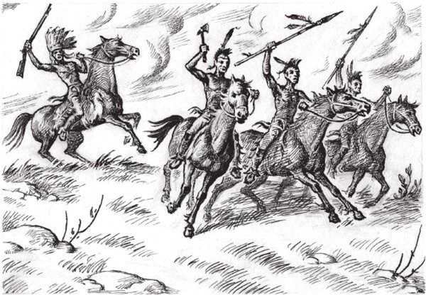 Топот копыт нарастал с угрожающей быстротой. В прерии мустанги развивали наибольшую скорость. Харка смотрел на запад, откуда доносился этот шум. Наконец на гребне холма появились чужие всадники. Они скакали, рассыпавшись в цепь. До них было еще далеко, но зоркие глаза охотников уже различали контуры врагов и видели, как те угрожающе потрясают копьями. Из лука их пока было не достать.