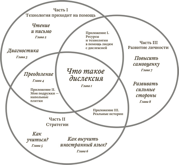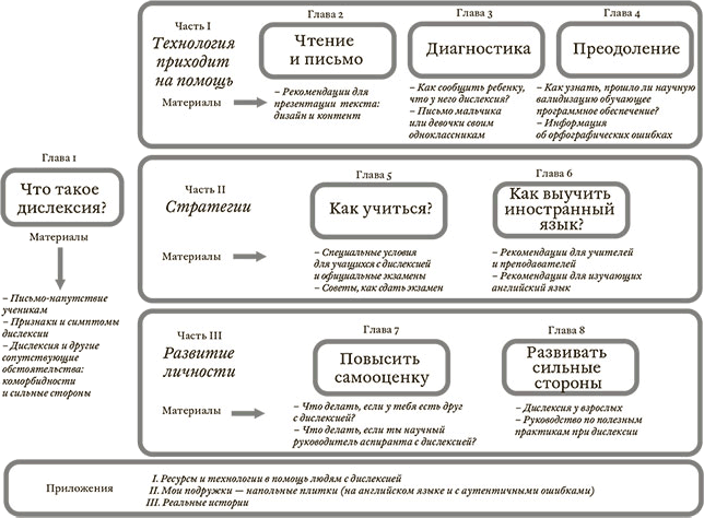 СТРУКТУРА КНИГИВ начале книги даются ответы на наиболее часто встречающиеся вопросы о дислексии (глава 1), а далее исследование делится на три части. В первой части («Технология приходит на помощь») описаны результаты исследования и техники, которые призваны помочь людям с дислексией в овладении навыками чтения и письма, а также в выявлении дислексии и ее преодолении (главы 2, 3 и 4). Во второй части («Стратегии») речь идет о развитии навыков, связанных с повышением успеваемости в школе и последующей профессиональной карьерой, таких как техники обучения, организация, продуктивность и изучение иностранных языков (главы 5 и 6). И наконец, третья часть («Развитие личности») посвящена теме, имеющей непосредственное отношение к дислексии, хотя о ней нередко забывают. Вниманию читателя предлагается обзор последних исследований в области самооценки, физических упражнений и сильных сторон, сочетающихся с дислексией, таких как креативность или визуальное мышление (главы 7 и 8), дополненный интервью из реальной жизни (приложение III). В приложении I («Ресурсы и технологии в помощь людям с дислексией») автор и сотрудники Change Dyslexia приводят периодически обновляемые ссылки на сайты с компьютерными ресурсами (