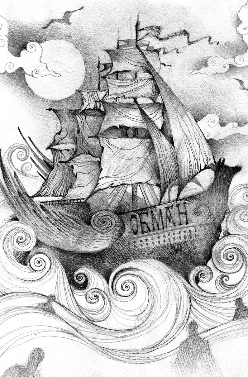 Перед Снежком властно держался на ужасной глубине трехэтажный корабль, на боку которого каллиграфическими буквами было написано «Обман». Корабль разделялся на три части, то есть три этажа, где за тысячами окон располагались отделы для пассажиров, матросов, капитанов и прочих работников. На звериных боках корабля расположились теперь уже сложенные орлиные крылья. В качестве завершающей детали, дополняющей противоречивый образ корабля, – бушприт в виде волчьей головы, как будто застывшей перед образом смерти.
