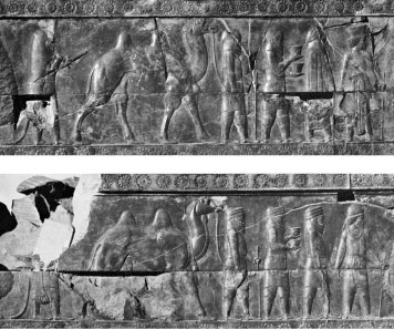 Четвертая и седьмая делегации на рельефах Ападаны: арии или арахоты. Последний посланник одет в шкуру пантеры или другого кошачьего хищника. Воспроизведено по: Walser G. Die Völkerschaften auf den Reliefs von Persepolis. Berlin, 1966. Taf. 11; 14.