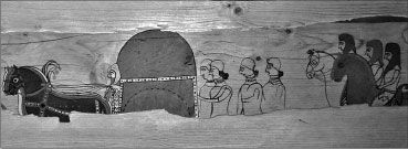 Женская повозка в сопровождении служанок и эскорта. Реконструкция росписи восточной стены деревянной гробницы у Татарлы (Фригия, ок. 470 г. до н. э.). Воспроизведено по изданию: Summerer L. Die persische Armee in Kelainai // Kelenai-Apameia Kibotos. Bordeaux, 2011. Abb. 4.