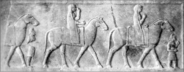 Рельеф из Даскелиона высотой 68 см с изображением женщин, едущих на мулах (рубеж V–V вв. до н. э.). Воспроизведено по: Osten H. H., von der. Die Welt der Perser. Zürich, 1956. S. 278. Taf. 63.