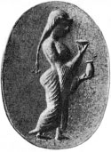 Персиянка с сосудом и пиалой. Малоазиатский халцедоновый скарабеоид. Государственные музеи Берлина, F.G. 181 (первая половина IV в. до н. э.). Воспроизведено по: Никулина Н. М. Искусство Ионии и Ахеменидского Ирана. М., 1994. Рис. 531.