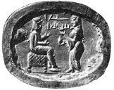 Сидящий знатный перс и персиянка, подносящая ему еду и питье. Малоазиатский халцедоновый скарабеоид (первая половина IV в. до н. э.). Музей Эшмола, Оксфорд, 1921.2. Воспроизведено по: Никулина Н. М. Искусство Ионии и Ахеменидского Ирана. М., 1994. Рис. 528.