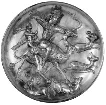 Серебряное позолоченное блюдо с изображением охоты шахиншаха Бахрама V Гура (420–38 гг.); Азада, сидящая позади, подает царю стрелу. Вероятно, из Северного Ирана (V–I вв.). Метрополитен-музей, The Guennol Collection (Нью-Йорк). Воспроизведено по: Harper P. O. The Royal Hunter: Art of the Sasanian Empire. New York, 1978. P. 48, fi g. 12.
