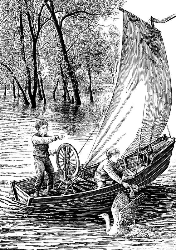 Мальчиков тянуло к воде, как уток. Летом они часами просиживали в пруду, ловя золотистых карасей в верши, сплетённые из лозы, и наблюдая за тем, как плотно наевшиеся гуси, затевая весёлую игру, носятся вперегонки по его зеркальной поверхности и, ленясь подняться на воздух, чертят лапками по воде.