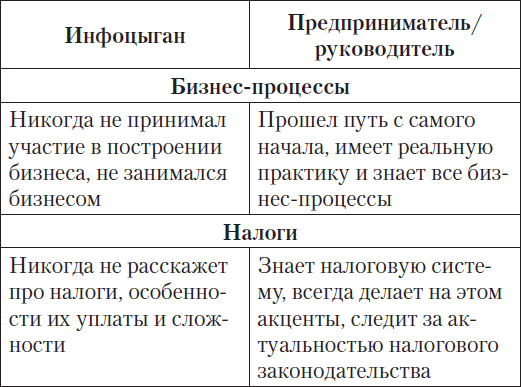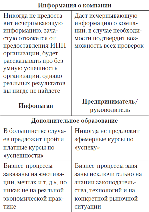 Данный список не является исчерпывающим. Добавлять можно безграничное множество разных параметров и характеристик, отличающих реального предпринимателя от «бизнес-коуча». Самое главное отличие – инфоцыгане не имеют никакого отношения к реальному бизнесу, они им никогда не занимались.