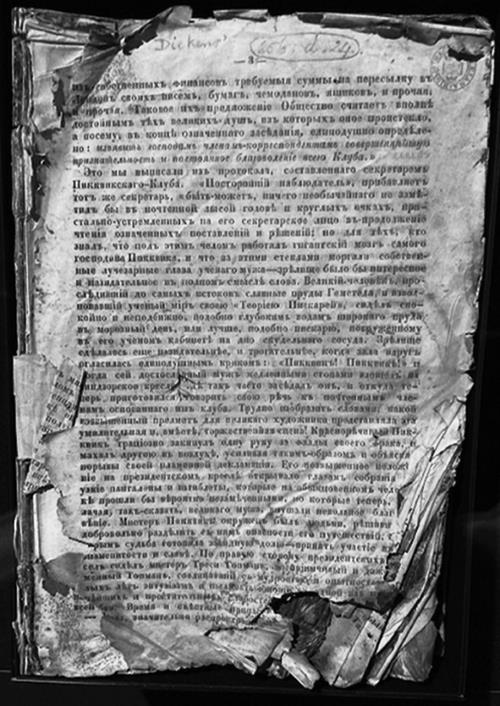 Но я ушел в сторону. В качестве примера библиотерапии на Оксфордской выставке был представлен застекленный экспонат с разъяснительным текстом на табличке. Это был обгоревший и, как указывала подпись, окрашенный кровью экземпляр русского перевода диккенсовских «Замогильных записок Пиквикского клуба», обнаруженный англичанами в Севастополе в 1855 году.