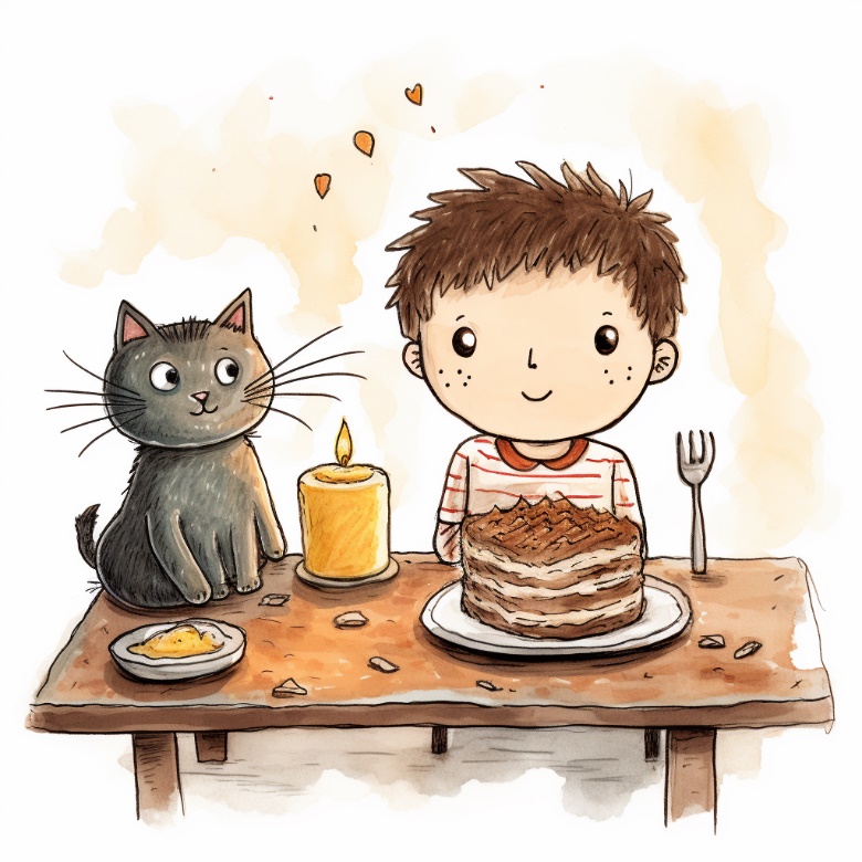 Именинник грустно вздохнул и отправился завтракать. Со вчерашнего праздника в холодильнике остался торт, и Тоби отрезал себе кусочек.