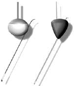 Устойчивость, а значит, и стабильность «работы» поплавка можно повысить, изменив (или изготовив изначально) его так, чтобы центр тяжести конструкции в целом был смещен книзу. Классическим примером может служить «ваглер» (рис. 40), который одинаково чувствителен при поклевках как на погружение, так и на подъем приманки, а скользящие модели обеспечивают эффективную ловлю на значительной глубине, даже если приходится ловить с берега. Этот поплавок не будет «плясать» на волнах и не будет парусить под воздействием ветра, так как леска, зафиксированная под водой у нижнего его конца, гораздо проще «преодолевает» поверхностное натяжение и по воле рыболова может быть погружена под поверхность воды.