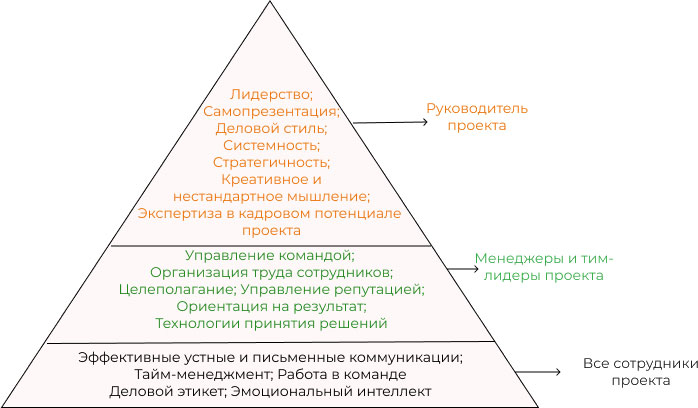На базовом первом уровне расположены компетенции, необходимые и достаточные абсолютно для всех сотрудников, работающих над проектом: эффективные устные и письменные деловые коммуникации, тайм-менеджмент, деловой этикет, работа в команде, эмоциональный интеллект.