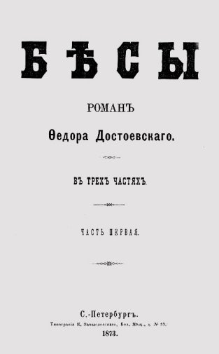 Роману предпосланы два эпиграфа: две строфы из «Бесов» А. С. Пушкина («Хоть убей, следа не видно, / Сбились мы, что делать нам? / В поле бес нас водит, видно, / Да кружит по сторонам. / … / Сколько их, куда их гонят, / что так жалобно поют? / Домового ли хоронят, / Ведьму ль замуж выдают?») и стихи 32—36 главы VIII Евангелия от Луки («Тут на горе паслось большое стадо свиней, и они просили Его, чтобы позволил им войти в них. Он позволил им. Бесы, вышедши из человека, вошли в свиней; и бросилось стадо с крутизны в озеро и потонуло. Пастухи, увидя случившееся, побежали и рассказали в городе и по деревням. И вышли жители смотреть случившееся и, пришедши к Иисусу, нашли человека, из которого вышли бесы, сидящего у ног Иисусовых, одетого и в здравом уме, и ужаснулись. Видевшие же рассказали им, как исцелился бесновавшийся.»).