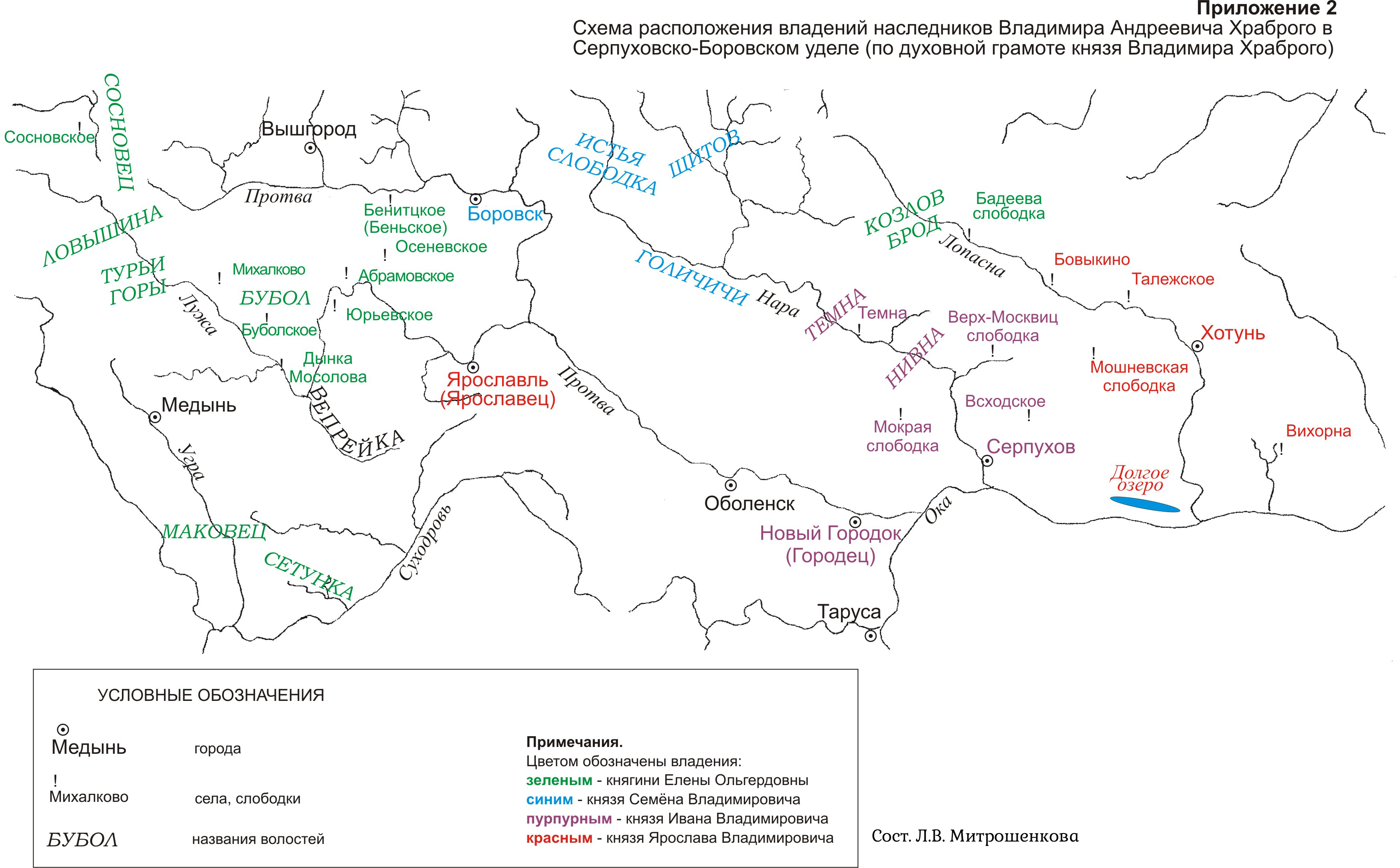 Обратимся к тексту грамоты. Третьему сыну Ярославу (Афанасию) завещал князь Владимир Андреевич Храбрый “Ярославль с Хотунью”, Вихорну, Полянку, Ростунову слободку, Мошневскую слободку. Почти все принадлежавшие Ярославу владения хорошо локализуются (см. приложение 2). Хотунь располагалась в нижнем течении р. Лопасны, Ростунова слободка – к северу от Хотуни. К юго-востоку от Хотуни, по р. Вихоренке – Вихорна. Пожизненно из владений Ярослава княгине Елене Ольгердовне было отдано Долгое озеро, которое находилось в нижнем течении р. Лопасны, а также – с. Бовыкино, располагавшееся на той же реке, но гораздо выше по течению (см. приложение 2).190 Во избежание конфликтов за земли между сыновьями Ярославом и Иваном, князь Владимир Андреевич подробно описал границу между принадлежавшей Ярославу Хотунью и серпуховскими волостями князя Ивана Владимировича. Подчеркнем, что ни одна будущая ярославецкая волость не входила в уделы наследников князя Владимира Андреевича Храброго, поскольку он ими не владел. На схеме в приложении 2 показаны владения жены Серпуховского князя Елены Ольгердовны и ее сыновей Ивана, Семена и Ярослава на территории Серпуховско-Боровского княжества. Локализованы не все топонимы, фигурирующие в духовной грамоте князя Владимира Андреевича, но общее представление об их взаимном расположении схема дает.