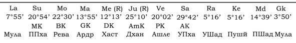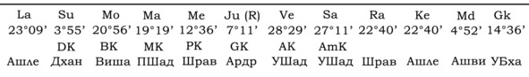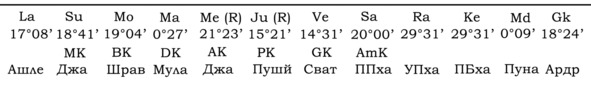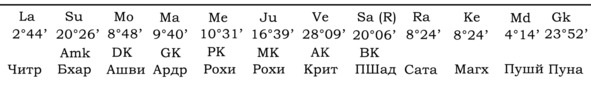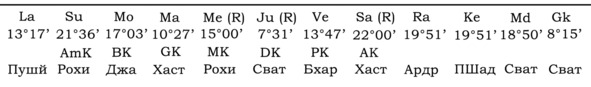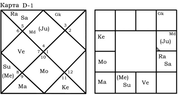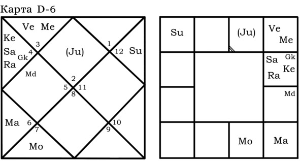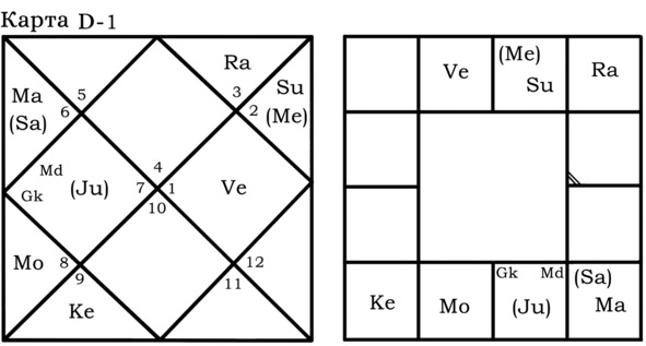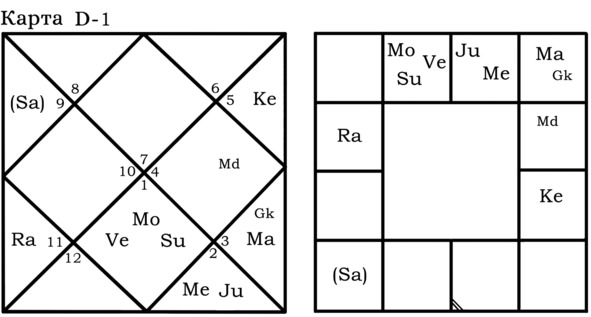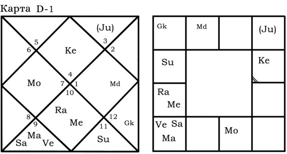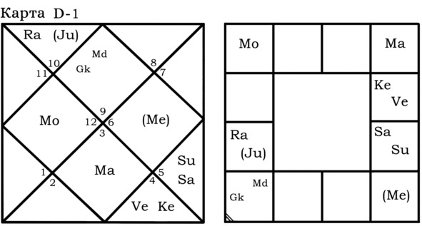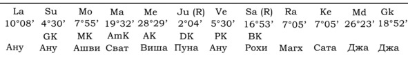 А вот пример гороскопа, в котором Gk играет важную роль для Марса и брачной жизни хозяина гороскопа. Упаграхи находятся в одном знаке с управителем 7-го дома.