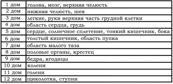Надо понимать, что дома гороскопа Д-6 связаны с телом Космического человека, и поражение одного из домов или знаков Зодиака формирует склонности к тем или иным заболеваниям.