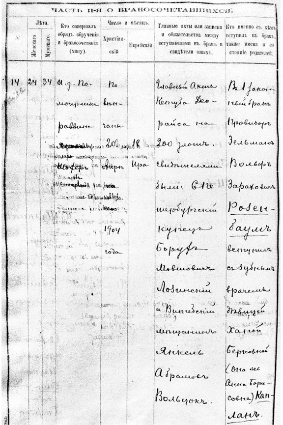 Регистрационная запись о бракосочетании Зиновия Захаровича (Зельмана-Вольфа Зораховича) Розенбаума и Анны Борисовны (Ханы Берковны) Каплан от 20 мая 1904 года.