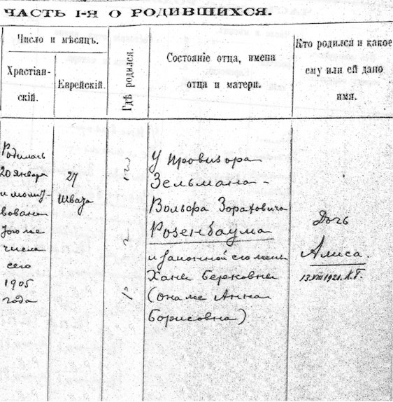 Регистрационная запись о рождении Алисы Розенбаум. 20 января 1905 г.