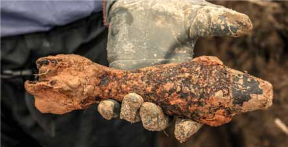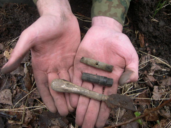Первые найденные железки не пугают. В первом же раскопе я нахожу неразорвавшийся минометный снаряд. Пока копала, стучала по нему саперной лопаткой, пока не подошел местный поисковик и не объяснил мне, что лучше так не делать. Я не испугалась. (Если честно, то испугалась я гораздо позже. Под Ржевом в 2010 г., когда перенося все те же минометные снаряды мелкого калибра, мне вдруг стало очень страшно. Показалось, что они сейчас взорвутся у меня в руках. Просто. Без причины, только от движения. Убежать хотелось и все бросить. Просто огромный страх. Из ниоткуда).