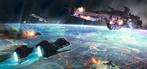 На орбите планет зависли сотни эсминцев и крейсеров, а также пять массивных линкоров, и это не считая носителей с москитным флотом. Некоторые корабли был отмечены следами ожогов и испещрены пробоинами, которые заделали на скорую руку. Несмотря на то, что их защищал двухметровый слой титановой брони, а вдобавок к ней ещё и современнейшее вооружение, многие люди предпочли бы чувствовать под ногами твёрдую землю, с настоящей гравитацией и настоящей атмосферой, а не болтаться в корабле на орбите планеты. Корабли людей также начали проводить перестроение, но в этот миг начали действовать гаусс мортиры которые были установлены на орбитальных крепостях. В момент выстрела по всей крепости проходила мелкая вибрация, а потом в полет уносилась металлическая болванка, которая после прохождения блоков конденсаторов получала ускорение и летела со скоростью равной половине скорости света.