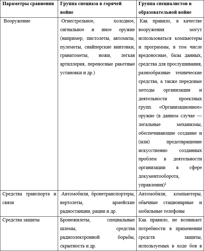 Сформируем общность и различие в деятельности группы спецназа в горячей войне и группы специалистов в образовательной войне по некоторым параметрам в виде таблицы: