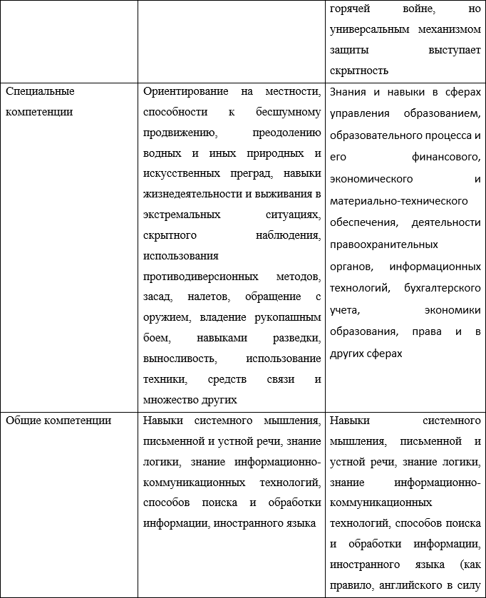 Как видно из таблицы, и спецназовцы, и специалисты в образовательной войне в одинаковой мере нуждаются в аналогичных по содержанию общих компетенциях. Поэтому будет верным выражение, что главным оружием армейского спецназа и специалиста образовательной войны будет выступать голова.