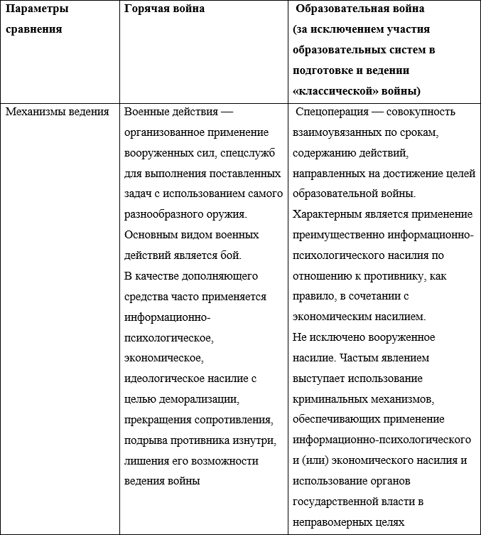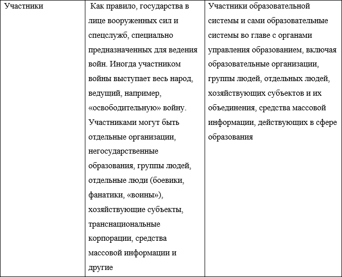 Представляет также интерес сравнение образовательной войны с горячей войной, включающей в себя войны между государствами. Попробуем выразить данное сравнение в виде нижеследующей таблицы: