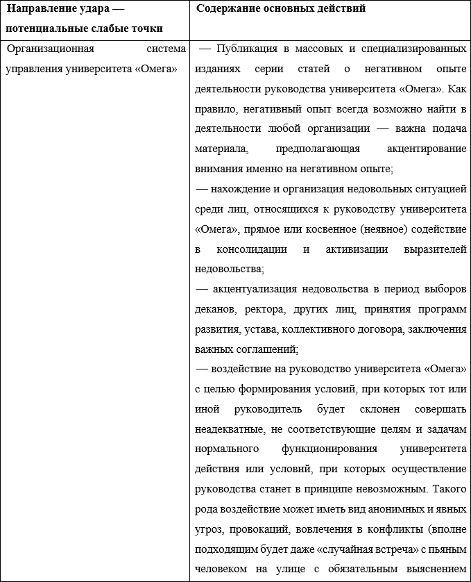 При нанесении удара по обороне университета «Омега», как видно из таблицы, также наиболее эффективным выглядит использование наиболее слабых мест в обороне. В качестве таковых выступают те или иные стороны деятельности образовательной организации, в которых уже заведомо присутствуют какие-либо проблемы и конфликты.
