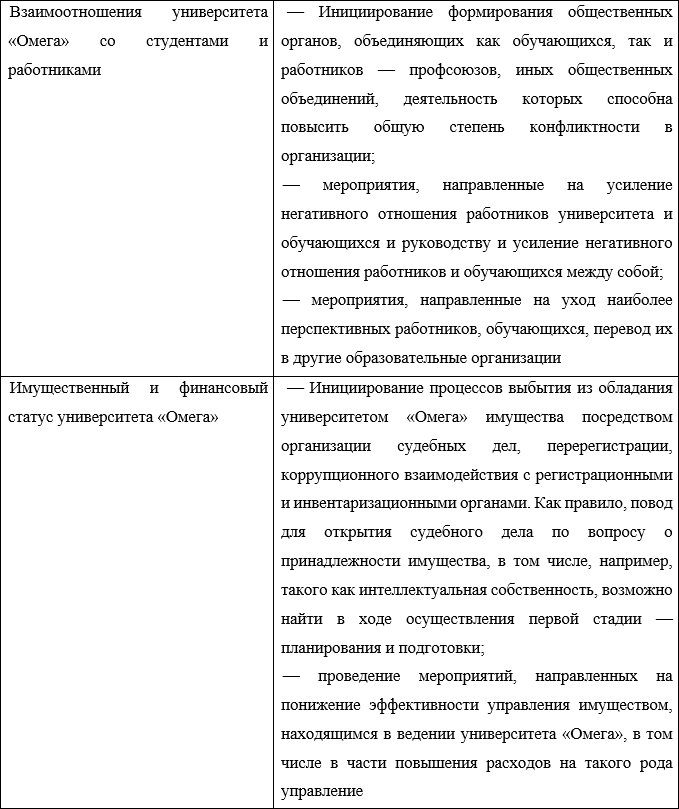 4. Вторая стадия войны между образовательными организациями – собственно ведение войны, предполагающее нанесение взаимоувязанных ударов, включающих, как правило, воздействия на организационную систему управления, имущественный и финансовый статус, систему взаимодействия с учредителем, обучающимися и работниками, другие выявленные в ходе подготовки и планирования уязвимые точки.
